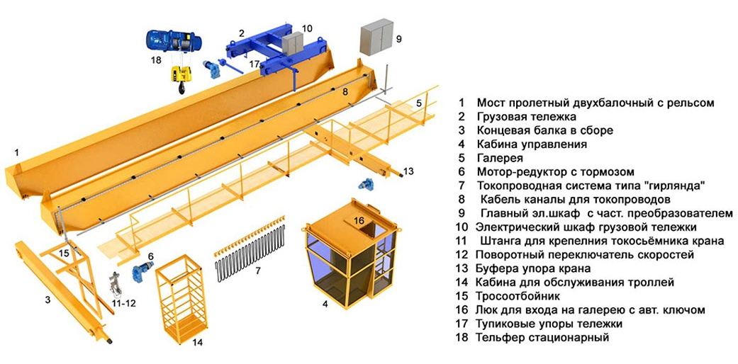 Мостовой кран состоит из нескольких взаимосвязанных узлов. Каждый из них выполняет свою функцию и влияет на надёжность и производительность всей конструкции. Разберём устройство мостового крана общего назначения и расскажем, какие задачи выполняет каждая часть.
